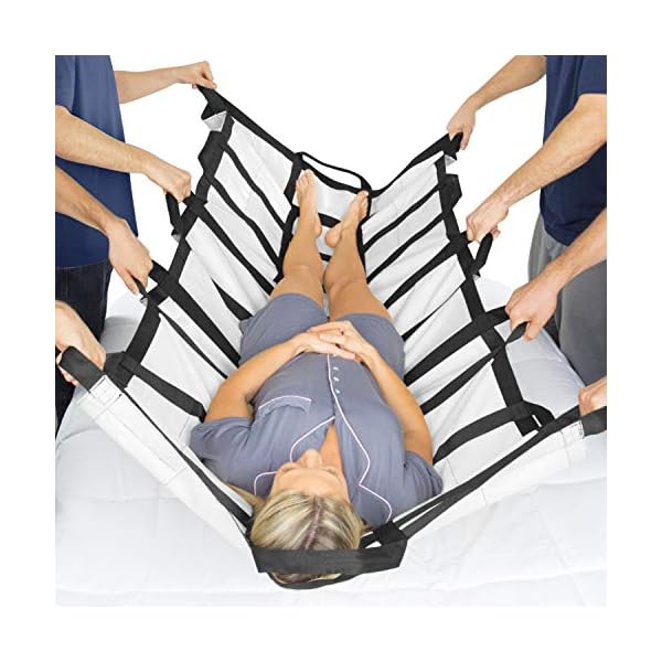 PADDED HAND STRAPS: Lightly padded for a comfortable grip, the transfer blanket is equipped with 4 handles, allowing the caregivers to assist from any angle. Each hand strap is also reinforced with durable stitching for greater strength.