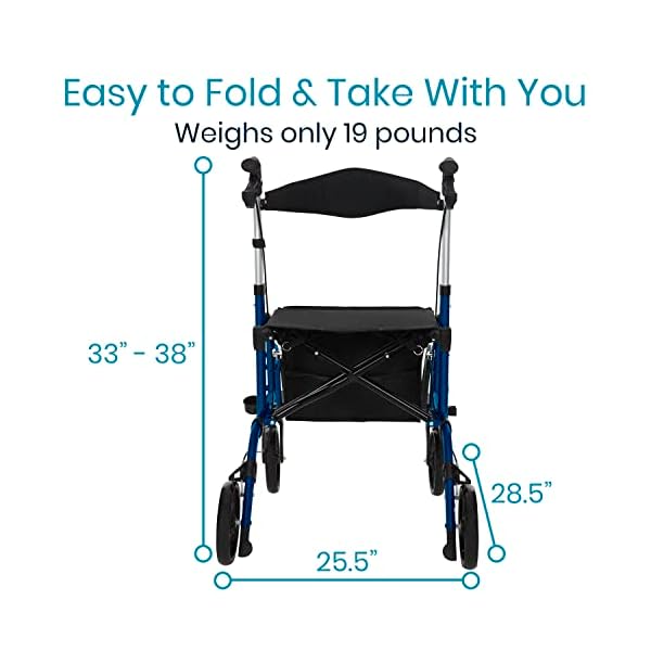 COMFORTABLE MESH SEATING: Made with a strong, breathable mesh, the dual function rollator transport chair provides comfortable seating with a wide platform of 18” across. A lightly padded backrest provides comfortable support when seated for travel or rest. As an added convenience, it also includes a detachable travel bag for safely storing daily necessities. Generously sized, it easily holds a purse or wallet, medications, snacks and electronic devices.