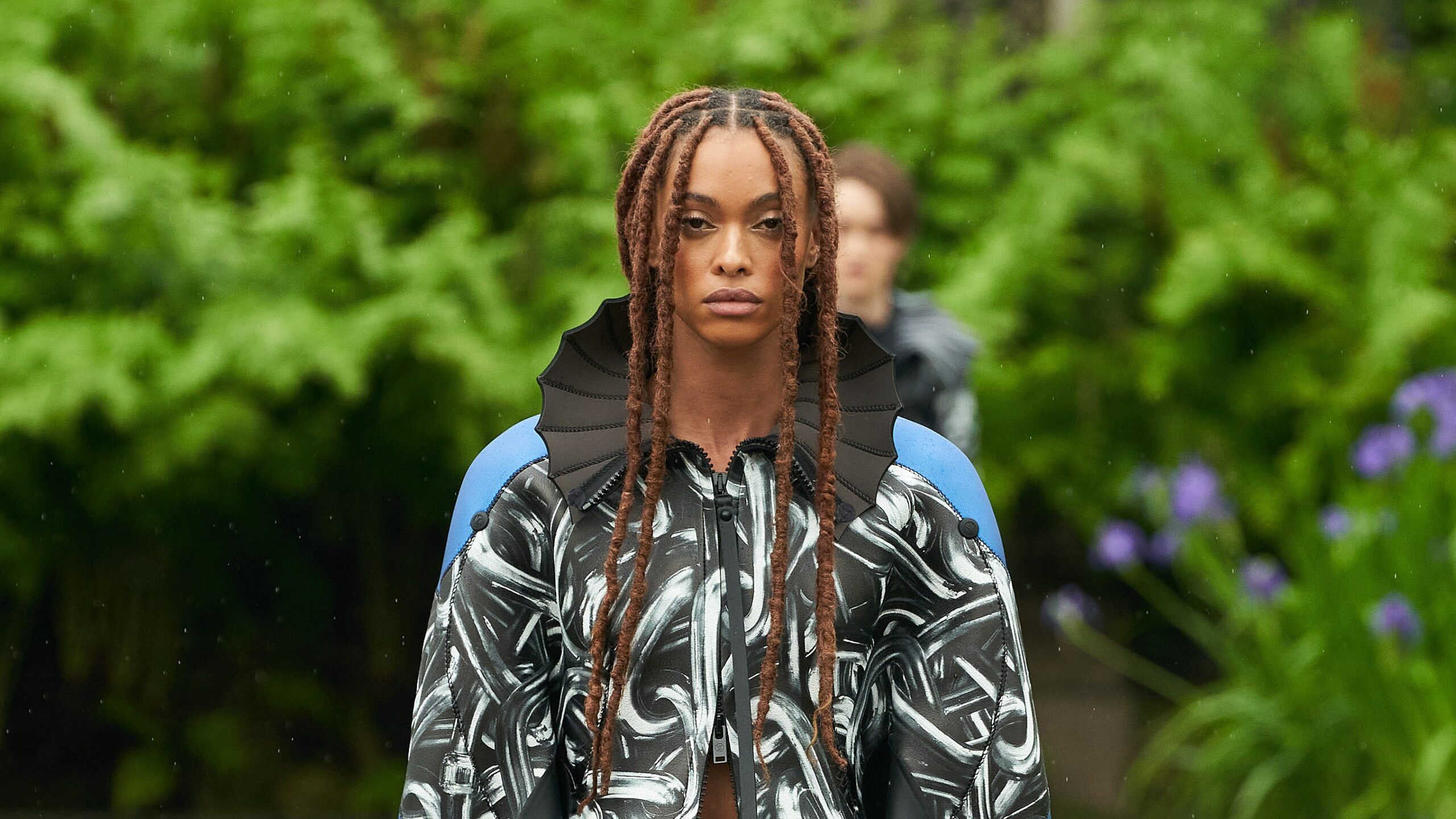 “By the end the mermaid becomes a flower, but maybe not a flower that exists,” Ghesquière said. That notion produced a group of long dresses in more of those pastel shades that qualified as real news for the designer, who has typically shied away from gowns on the runway at LV. They were delicate and bold simultaneously, a mix of silk, georgette, organza, and lace from their softly draped bodices and pouf sleeves to their sculptural, swingy hems. Who needs mysterious lakes when you have the power of imagination? Who wants quiet luxury when you can have a couture-level cape with water droplet beading or a quilted damask jacket featuring wyvern, unicorn, and other legendary creatures? A captivating, transportive show.